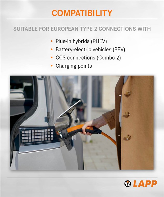 • Typ-2-Ladekabel von LAPP ermöglicht einfaches und schnelles Laden mit bis zu 22 kW an einer öffentlichen oder privaten Ladestation oder Wallbox