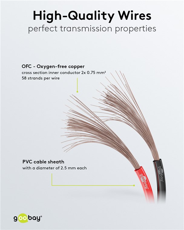 - Als Meterware geliefert, kann das Goobay-Hi-Fi-Lautsprecherkabel für den jeweiligen Einsatz selbst konfektioniert werden.