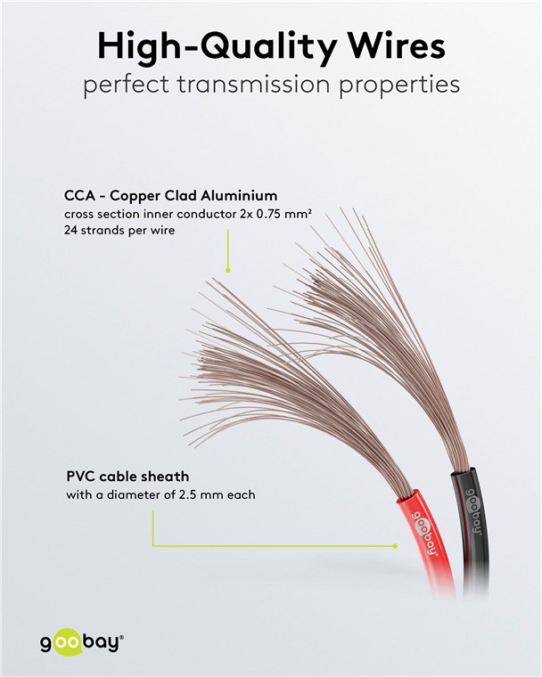 - Lautsprecherkabel mit hochwertiger Litze (CCA: Copper Clad Aluminium) für gute Übertragungseigenschaften z. B. zwischen Hi-Fi-Anlage und Lautsprecher