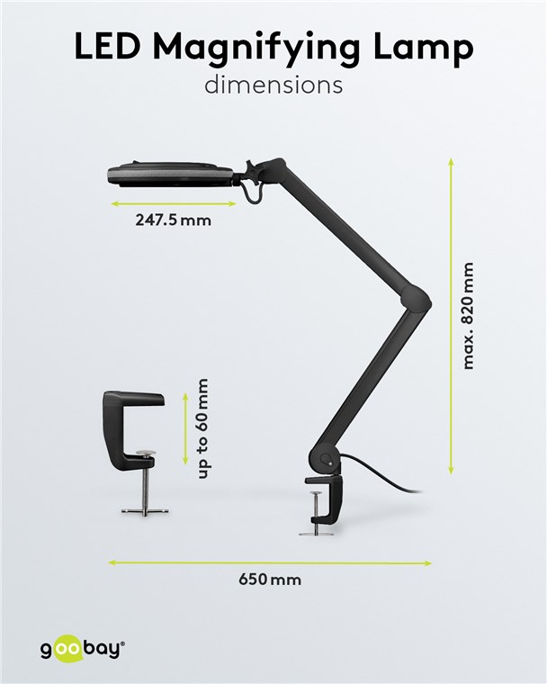 - Die Halterung der Lupenlampe ist für bis zu 60 mm starke Tischplatten geeignet. Ersatztischklemme: 64987, passende Wandhalterung: 64991.