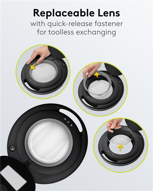- Kristall-Glaslinse (inkl. Schutzkappe) der Kosmetiklampe mit 3 Dioptrien und 1,75-facher Vergrößerung ist dank Schnellverschluss werkzeugfrei austauschbar.