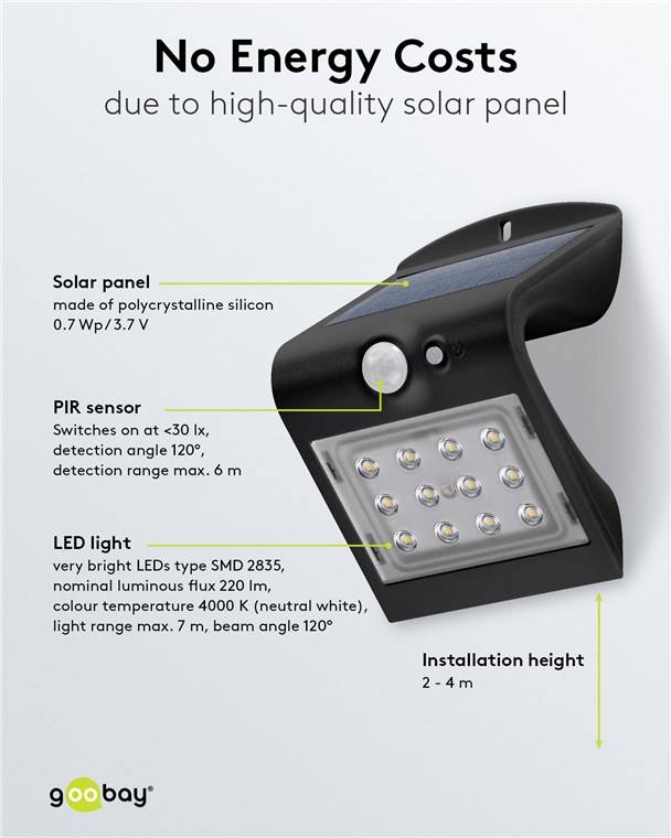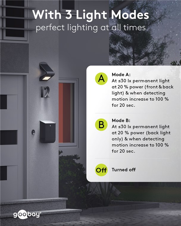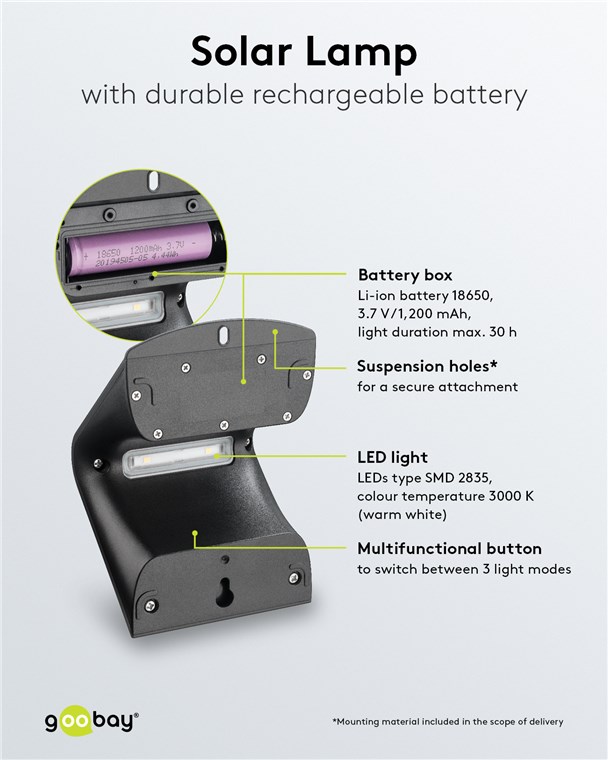 Unsere LED-Solarleuchten für den Außenbereich verursachen keine Stromkosten und sind äußerst langlebig. Hochwertige Solarpanele, stabile Gehäuse und eine einfache Montage zeichnen unsere Solar-Leuchten für Garten und Balkon aus. Goobay bringt Licht ins Dunkel. Einfach. Alles. Passend!