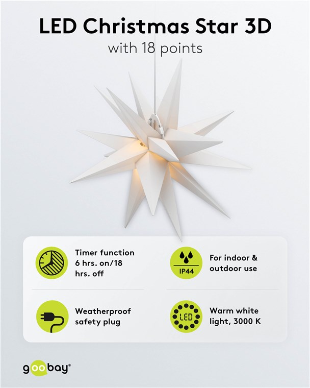 Außenstern mit Timer und 18 Zacken, warmweiß (3000 K), für den Innen- und Außenbereich (IP44), Kabel 9,5 m