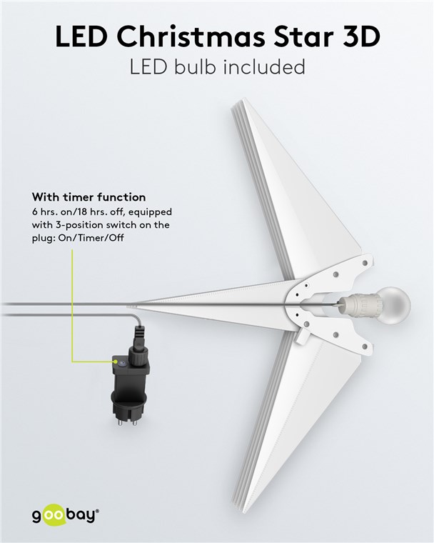 • Mit Timerfunktion: 6 Std. an/18 Std. aus, Schalter mit 3 Positionen am Stecker: On/Timer/Off