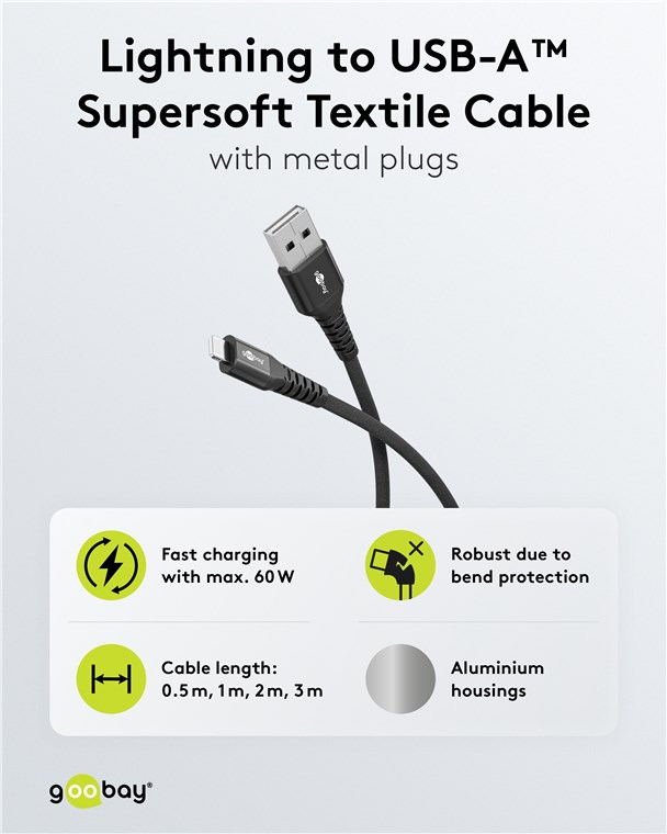 - Der geflochtene Textilmantel des Goobay USB-Ladekabels bietet eine angenehme Haptik und ist schonend auf sensiblen Oberflächen