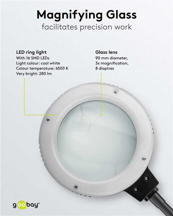 • 3-fache Vergrößerungslupe mit 90 mm Durchmesser und Beleuchtung mit 16 LEDs macht selbst feine Detailarbeiten möglich