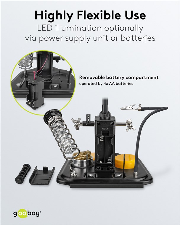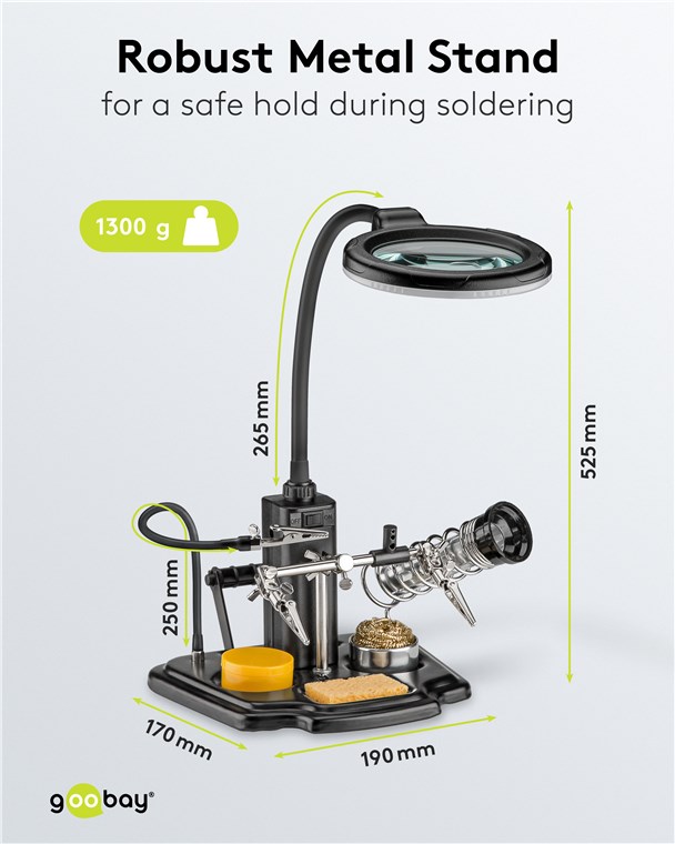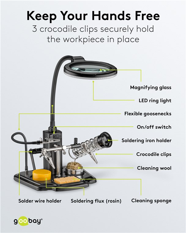 • Flexibel anpassbare Schwanenhälse an Lupe und Krokodilklemme ermöglichen Arbeiten aus jedem Winkel
