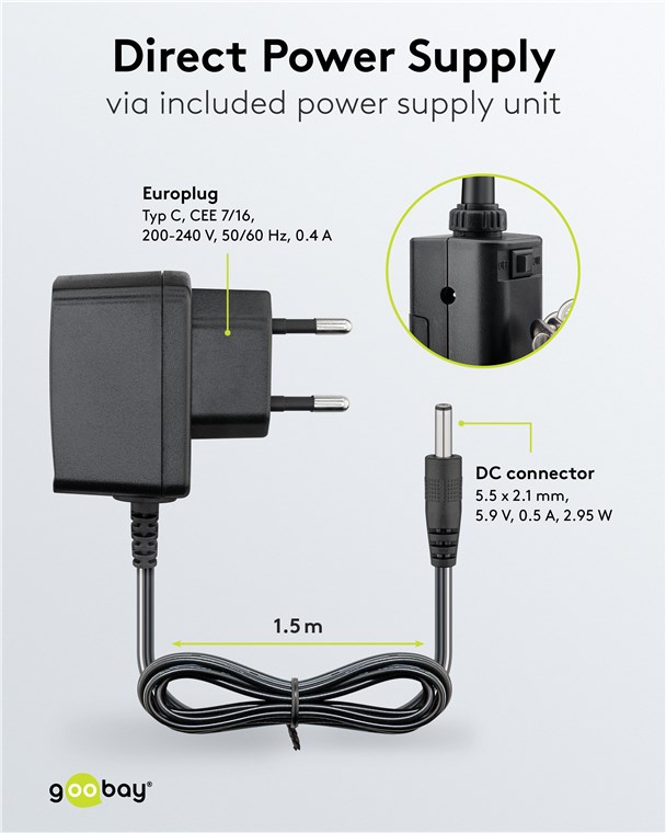 • Betrieb ist entweder über Netzteil (Eurostecker) oder 4x AA-Batterien möglich (Batterien nicht enthalten)