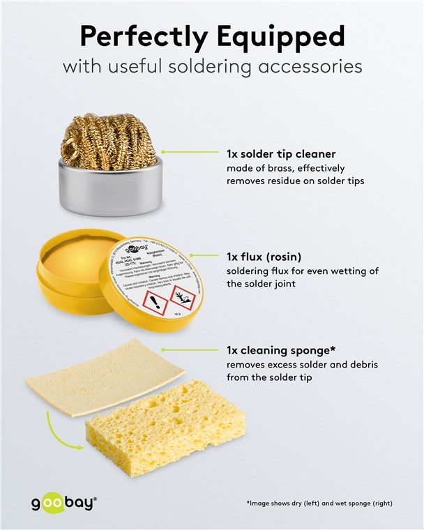• Reinigungsschwamm entfernt überschüssigen Lötzinn und Ablagerungen, die sich während der Arbeit ansammeln (Lieferung in trockenem Zustand, quillt beim Kontakt mit Wasser auf)