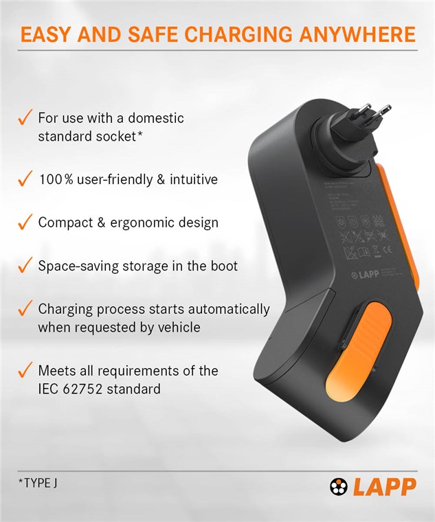 • LAPP Ladegerät ermöglicht einfaches, mobiles Laden über haushaltsübliche Schweizer Steckdosen (Stecker-Typ J) und ist ideal unterwegs oder auch in der heimischen Garage
