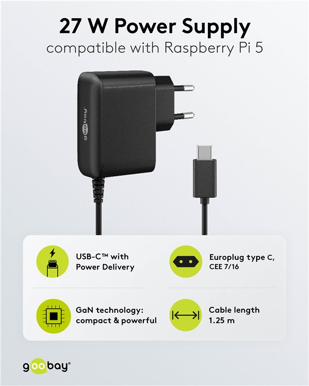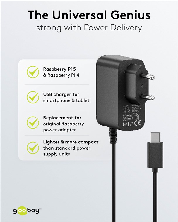 - Unterstützt Power Delivery und die Spannungsprofile 5 V, 9 V, 12 V und 15 V, sodass der RPi auch sicher versorgt wird, wenn stromintensive Komponenten angeschlossen sind