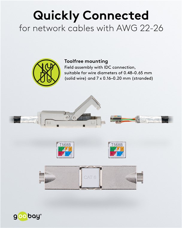• Geeignet für unkonfektionierte Patchkabel mit AWG 22-26 (Leiterdurchmesser: Volldraht 0,48 - 0,65 mm, Litze 7 x 0,16 mm - 7 x 0,20 mm und Kabelmanteldurchmesser: 5,0 - 7,5 mm)