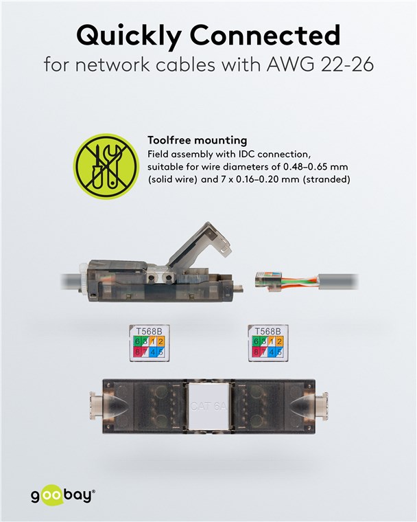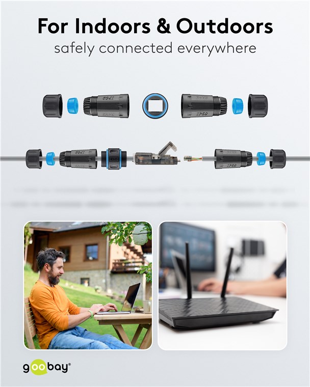 Der Kabelverbinder ist auf eine 8-adrige Verbindung, Verlängerung, Reparatur oder Umverlegung von Datenkabeln ausgelegt. Der große Vorteil gegenüber Netzwerk-Verbindungsboxen ist dabei das schlanke Design. Kabelverlängerungen können so auch problemlos bei geringem Platzbedarf, z. B. in Kabelschächten, vorgenommen werden. Goobay hat immer das richtige Produkt für Ihre Netzwerkverbindung. Einfach. Alles. Passend!