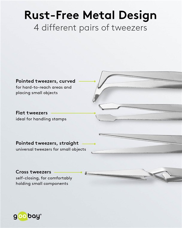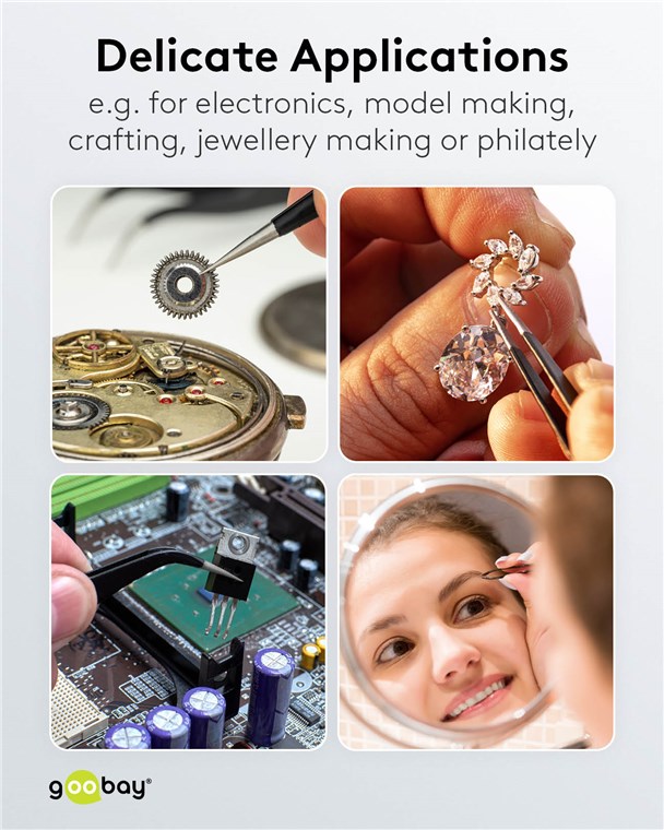 Die Pinzetten sind der perfekte Helfer für alle Präzisionsarbeiten, vom Modellbau bis zur Philatelie. Durch die vielseitigen Formen ist für alle Einsatzzwecke stets die richtige Pinzette griffbereit.