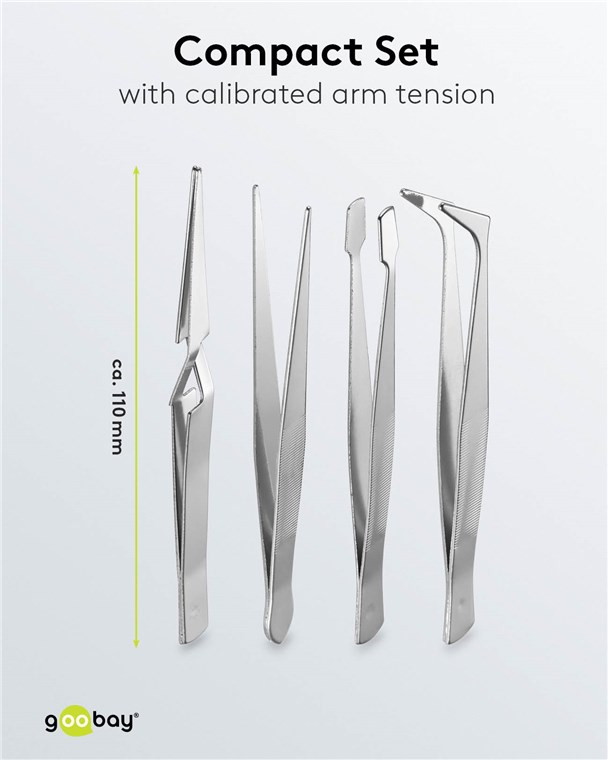 - Inkl. 1x Spitzpinzette, gerade, 1x Spitzpinzette, gebogen, 1x Flachpinzette (Briefmarkenpinzette), 1x Kreuzpinzette