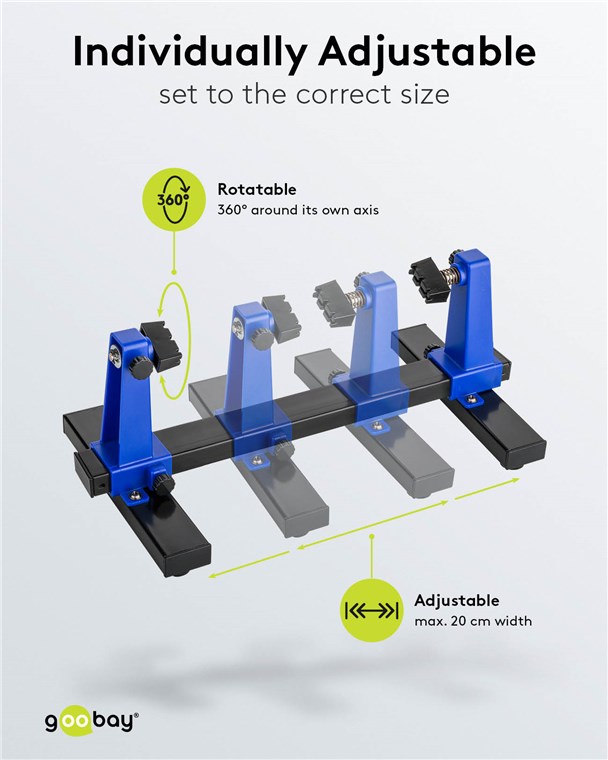• Passend für Platinen mit einer Breite bis zu 20 cm. Für eine volle 360°-Drehung darf das Werkstück bis zu 13 cm hoch sein