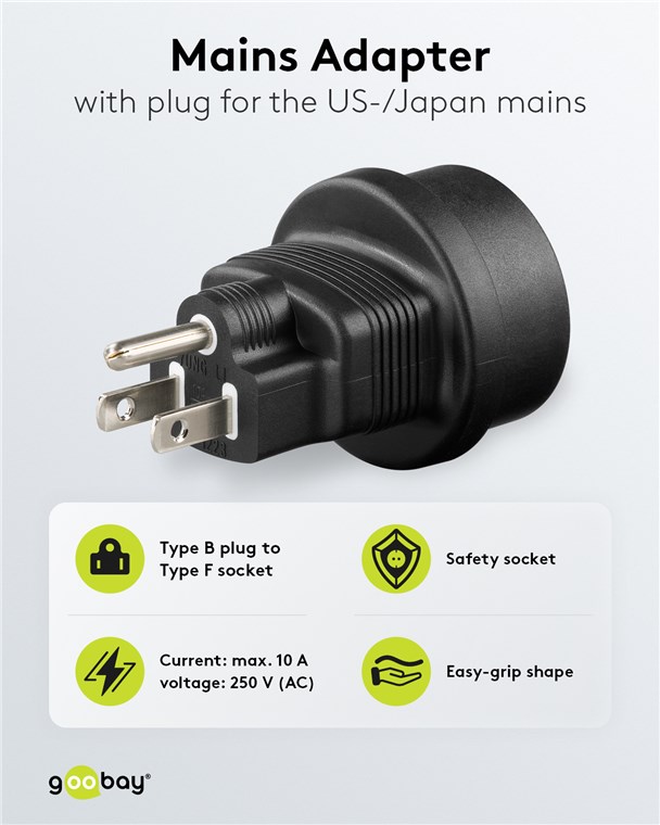 - Praktischer Reisestecker zum Anschluss elektrischer Geräte mit Schutzkontaktstecker (Typ F) an Steckdosen in den USA oder Japan (Typ B)