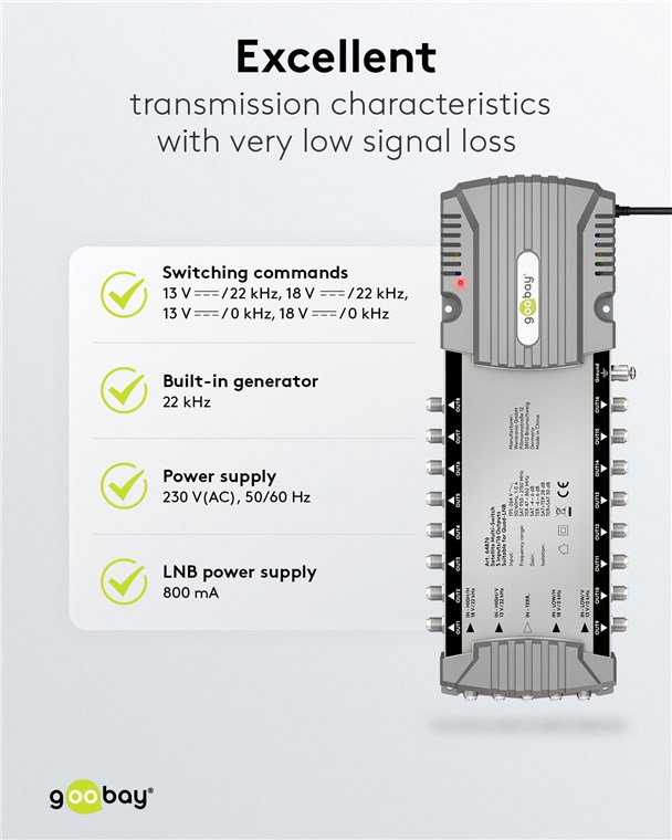 • Verfügt über einen integrierten 22-kHz-Generator und ist sowohl für Quattro-LNB als auch Quad-LNB geeignet