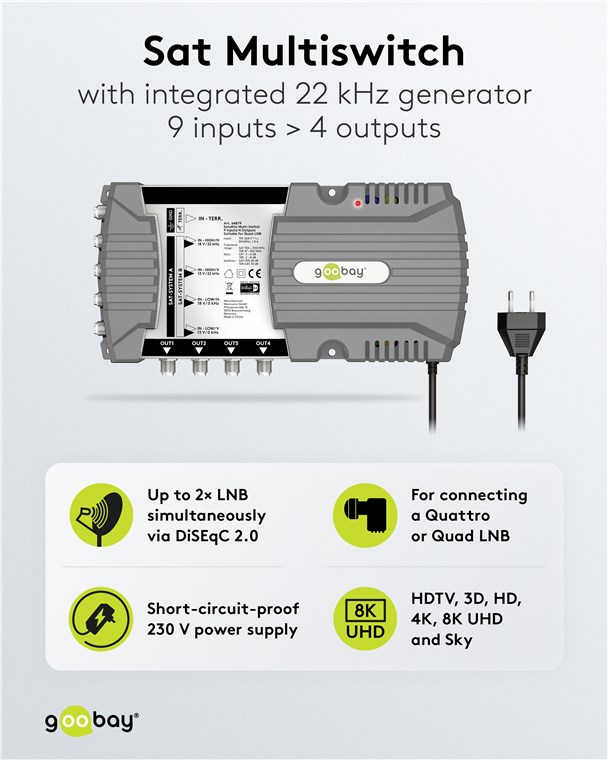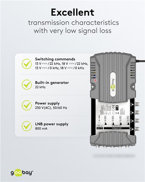- Verfügt über einen integrierten 22-kHz-Generator und ist sowohl für Quattro-LNB als auch Quad-LNB geeignet