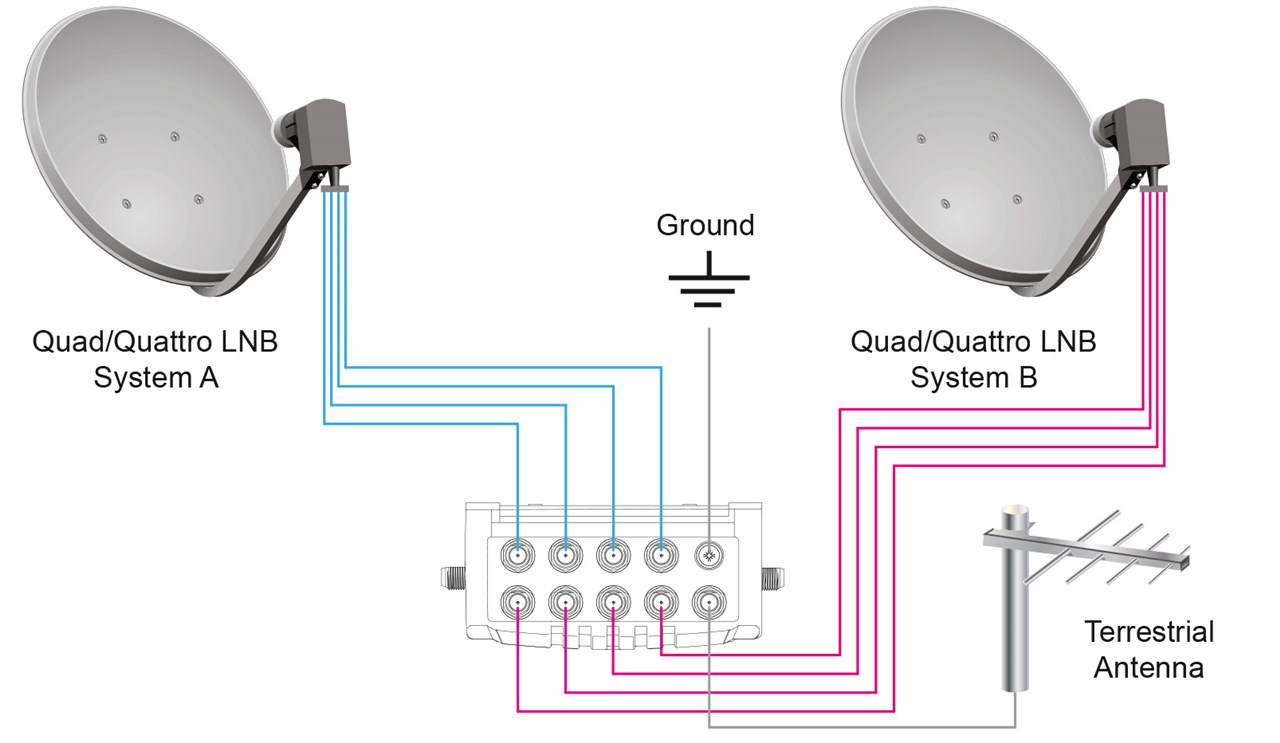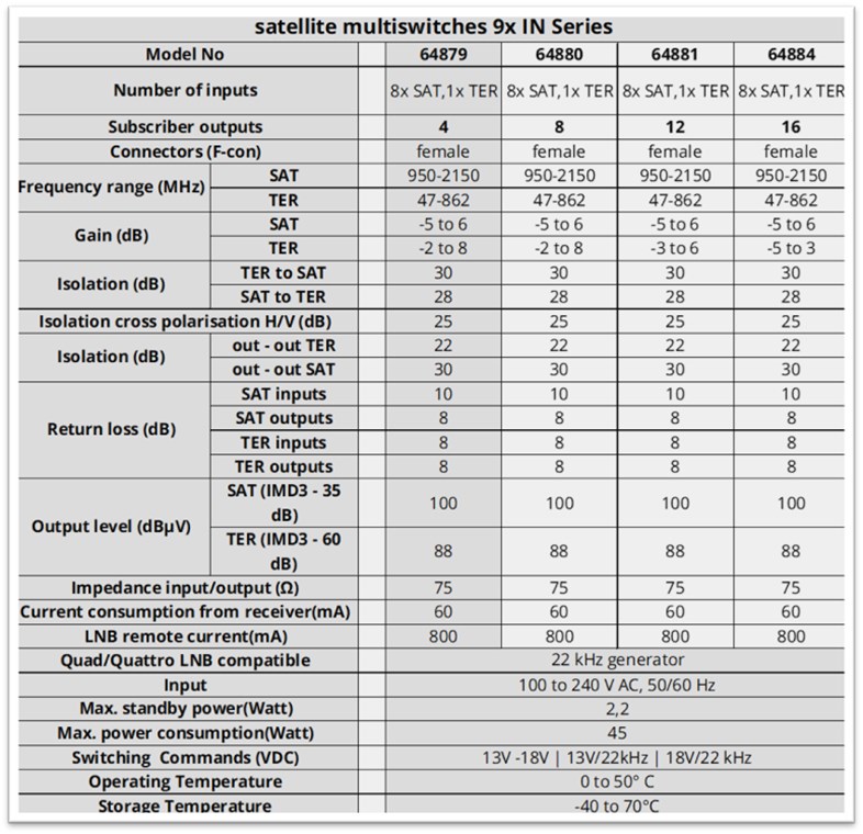 - Via DiSEqC 2.0 sind zwei Satelliten-Positionen schaltbar, die über Koaxkabel auf bis zu 4 Teilnehmer verteilt werden können, z. B. auf Sat-Receiver oder Fernseher mit Sat-Tuner