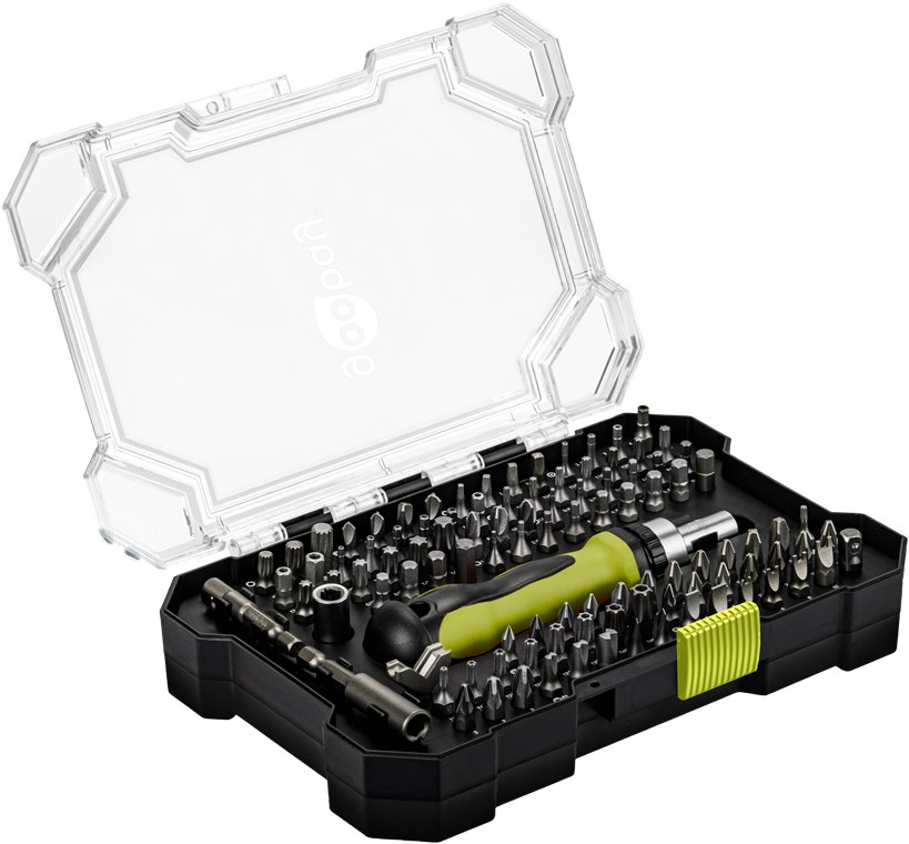 • Inkl. 99 Bits aus stoßfestem S2-Stahl: 4x Flachschlitz, 21x Kreuzschlitz (PH, PZ), 22x Innensechsrund (T, TH), 4x Tri-Wing, 4x Vierkant, 31x Hexagon (H, Hex Pin), 3x 12-Punkt (M), 3x Clutch (C ), 4x Spanner (U), 3x Torque