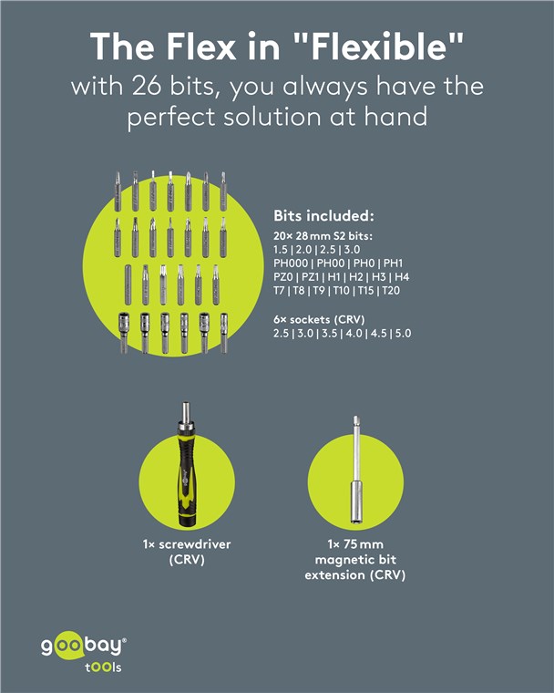 - Inkl. 1x Bit-Halter-Verlängerung (Länge 75 mm), 6x Stecknüsse (2,5-5 mm, CRV) und 20 Bits aus stoßfestem S2-Stahl: 4x Flachschlitz, 6x Kreuzschlitz (PH, PZ), 4x Sechskant (H), 6x Innensechsrund (T)