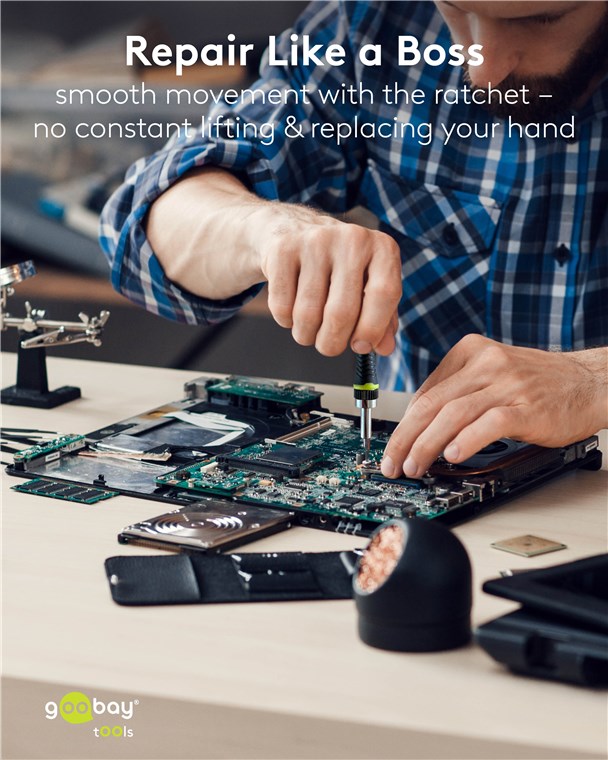 - Durchdachtes Design: Der schlanke Schraubendreher mit gummiertem Griff und Ratschenfunktion liegt gut in der Hand und sorgt für das nötige Feingefühl bei der Arbeit an Smartphone, Laptop, PC, Drohne etc.