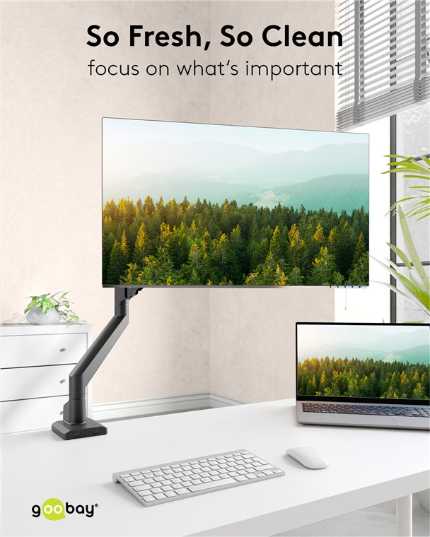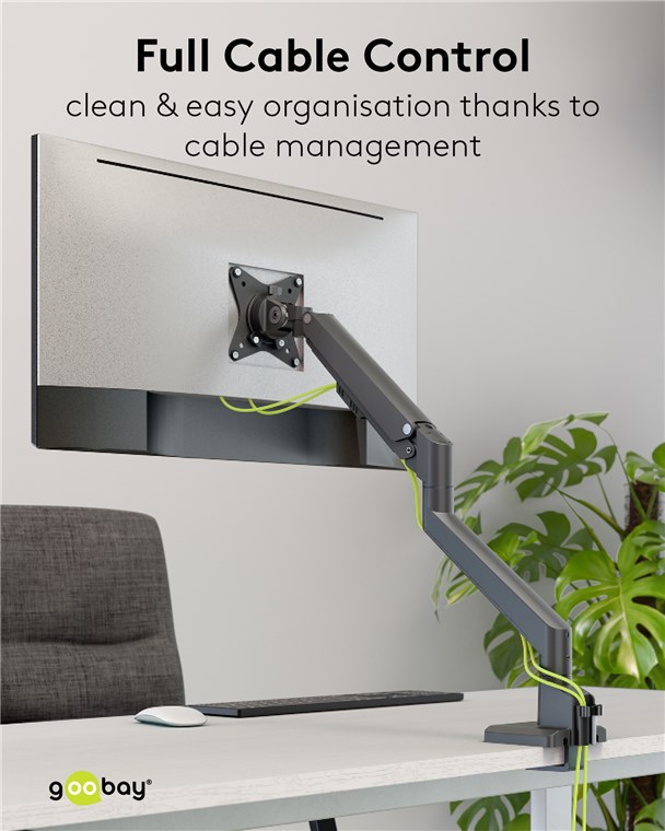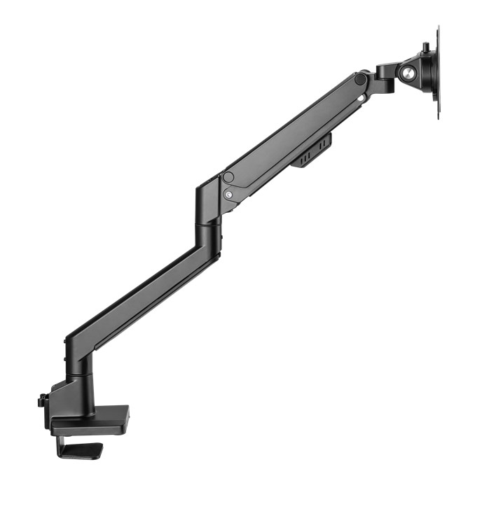 Die Monitorhalterung ist die perfekte Ergänzung für den ergonomischen Arbeitsplatz und passt sich allen Anforderungen des Alltags an. Ob Mobile Office, Gaming oder Multimedia-Anwendungen: Mit dem hochwertigen Gasdruckfedermechanismus lässt sich der Monitorarm auf das Monitorgewicht einstellen und flexibel ausrichten – jederzeit und absolut mühelos. Der kompakte Standfuß schafft zusätzlichen Platz auf dem Schreibtisch und sorgt mit dem integrierten Kabelmanagementsystem für eine saubere Optik.