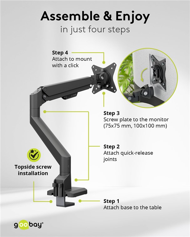 • Einfaches Einhängen: Im ersten Schritt VESA-kompatible Platte an den Monitor anschrauben, im zweiten Schritt in die Monitor-Halterung einhängen und Verschluss einrasten