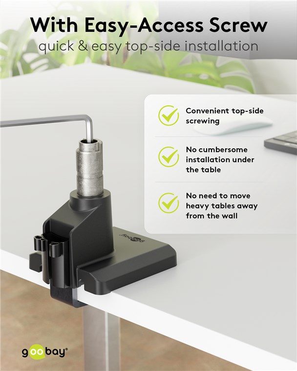 • Komfortable Installation dank Easy-Access-Schraube auf der Oberseite des Fußes, ohne unbequeme Anbringung unter dem Tisch und ohne Abrücken schwerer Tische von der Wand