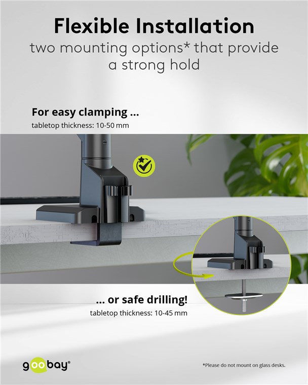 • Die Montage erfolgt schnell und einfach mit dem inbegriffenen Montagematerial, entweder über eine Schraube mit Bohrung oder über eine Tischklemme, die rückstandsfrei entfernt werden kann