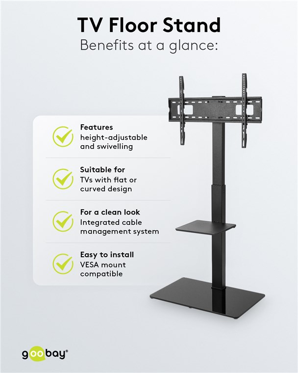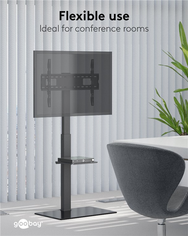 Starker Standpunkt, smarter Einsatz: Der robuste TV-Bodenständer ist die erste Wahl für Präsentationen oder Info-Screens bei Konferenzen, im Büro und im Empfangsbereich. Besonders in Räumen mit Glasfronten, in denen klassische Wandhalterungen keine Option sind. Mit einem Schwenkbereich von 35° und dem Teleskopständer ist die Halterung außerdem deutlich flexibler als Standard-TV-Ständer.