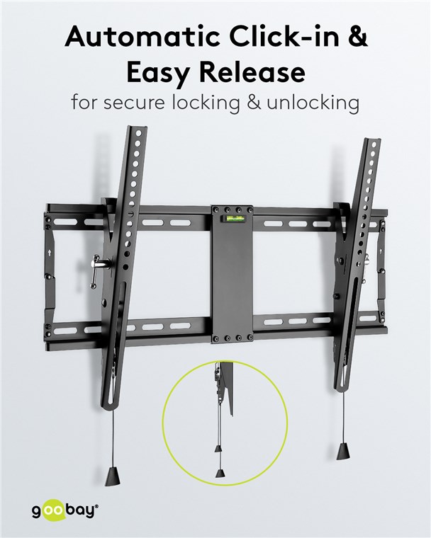 - Automatic Click-in & Easy Release: TV auf den Wandhalter hängen und durch Drücken sicher einrasten. Zum Öffnen des Click-in-Systems an den Schlaufen ziehen – schon lässt sich der Fernseher einfach abnehmen