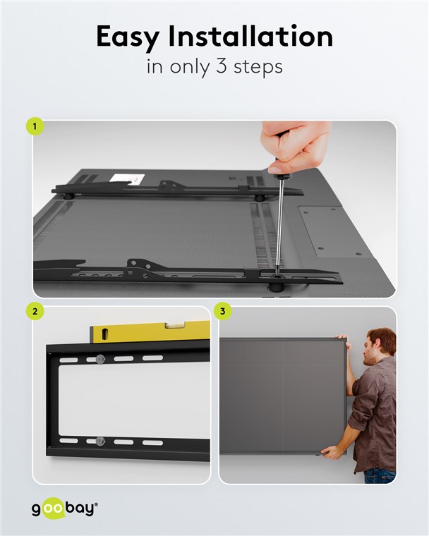 • Montagefreundlich: Im ersten Schritt die Montageschienen am Monitor anbringen, im zweiten Schritt die Schiene in die TV-Halterung einhängen