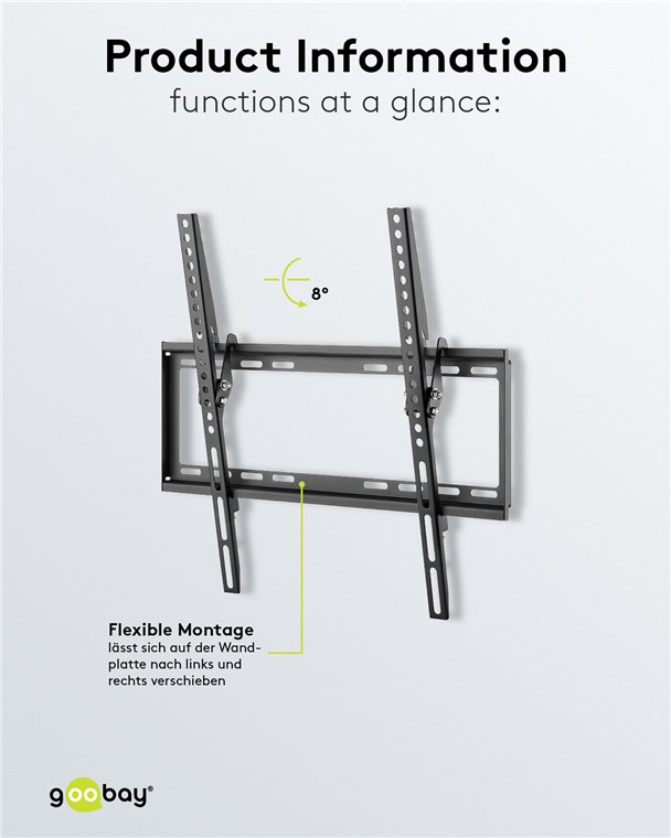 • Flexibel auf der Wandschiene nach links oder rechts versetzbar, für eine optimale Ausrichtung der Fernsehhalterung auch nach der Installation