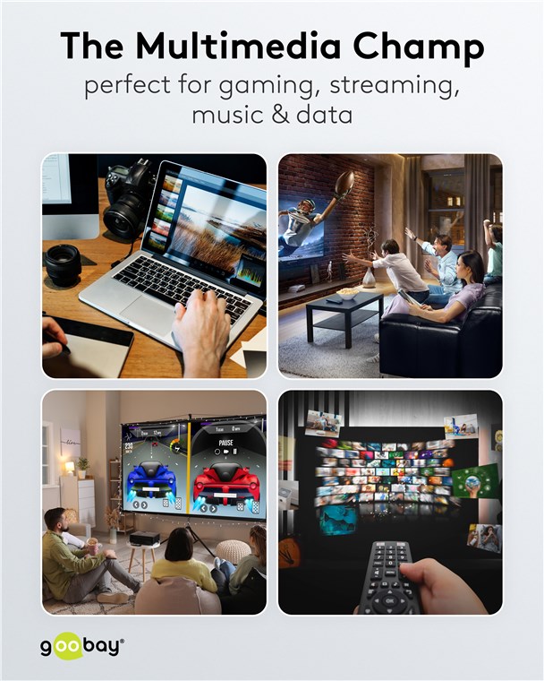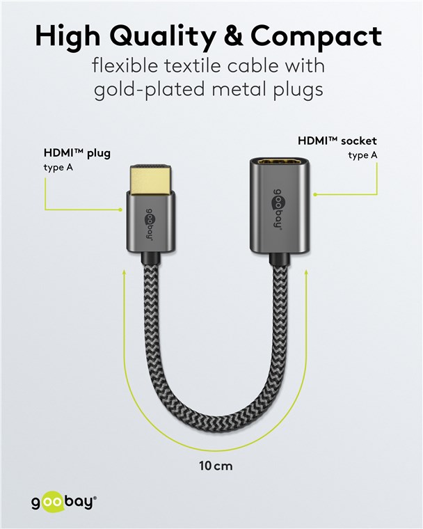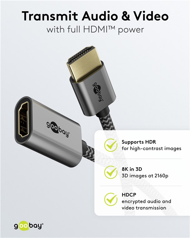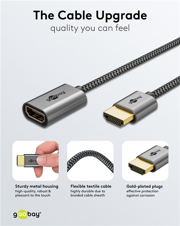 Die Goobay Plus Serie im schlanken, edlen Metalldesign in Sharkskin Grey. Das hochmoderne HDMI™-Kabel erreicht Spitzenwerte in puncto Auflösung und Übertragungsgeschwindigkeit und ist auch für anspruchsvolle Funktionen wie ARC, HDR und 3D-Inhalte optimal geeignet.
