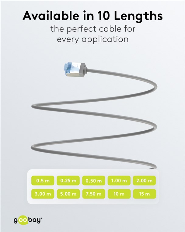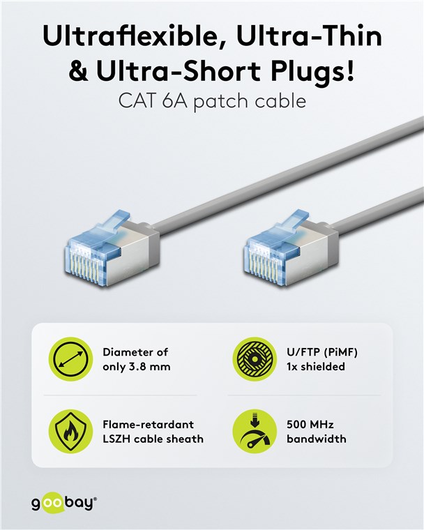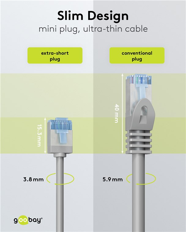 Eine CATegorie für sich: Die superslimmen CAT-Kabel mit extrakurzen Steckern reduzieren das Materialvolumen in Serverschränken und Patchpanels drastisch - für eine deutlich verbesserte Luftzirkulation und einen geringeren Wärmestau als bei herkömmlicher Verkabelung. Zusätzlich sorgen der weiche TPE-Mantel und schlanke Kupferleiter für die besondere Flexibilität und Materialeffizienz, die diese Kabelgeneration zum perfekten Netzwerkpartner machen.