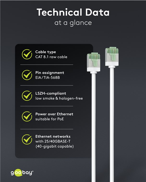 • Mit einer Übertragungsbandbreite von bis zu 2 GHz (2.000 MHz) besitzt das Ethernetkabel die 4-fache Bandbreite von CAT-6A-Kabeln