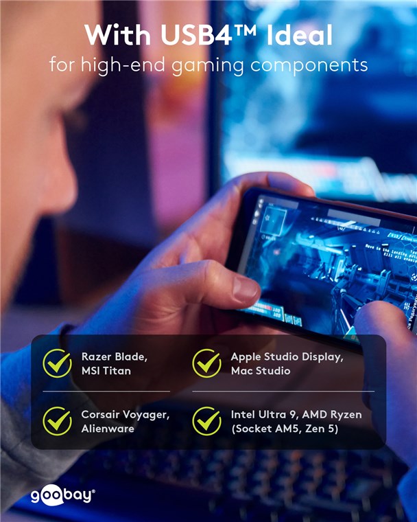 - USB4™ ist kompatibel mit High-End-Gamingkomponenten, z. B. mit dem Razer Blade 18, Corsair Voyager, Apple Studio Display oder Prozessoren der Reihe AMD Ryzen (Zen 3+, Zen 5)