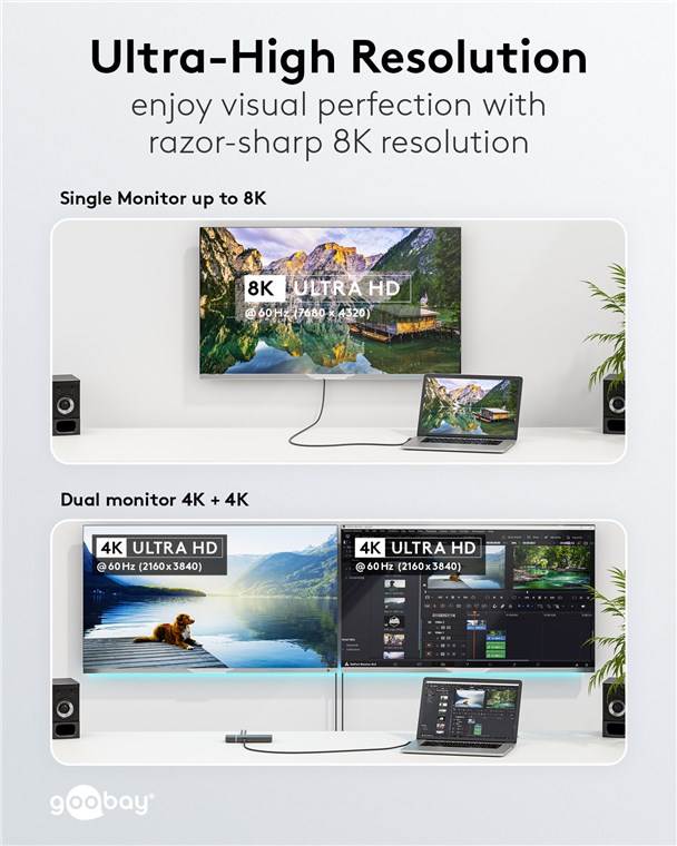- Das Kabel unterstützt ultrahohe Auflösungen bis zu 8K @ 60 Hz/4K @ 120 Hz auf Einzelmonitoren und bei Signalaufteilung auf zwei Monitore über einen Hub jeweils 4K @ 60 Hz