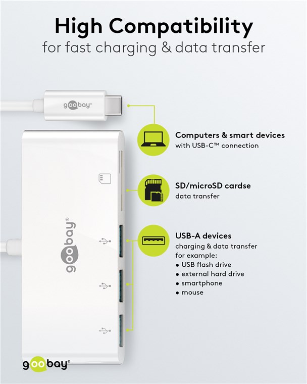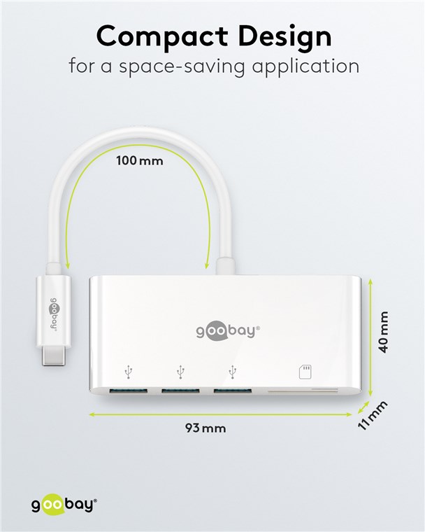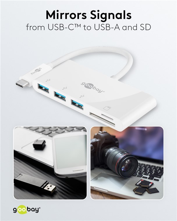 erweitert einen USB-C™-Port um drei USB-A-Anschlüsse (USB 3.0) sowie einen Kartenschacht für SD-/MMC- und microSD-Karten