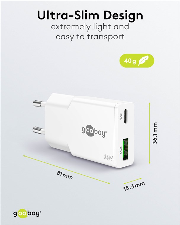 - Im kompakten, reduzierten Slim-Design gleitet das USB-C™-Netzteil einfach in jede Tasche und ist der perfekte Begleiter auf Reisen