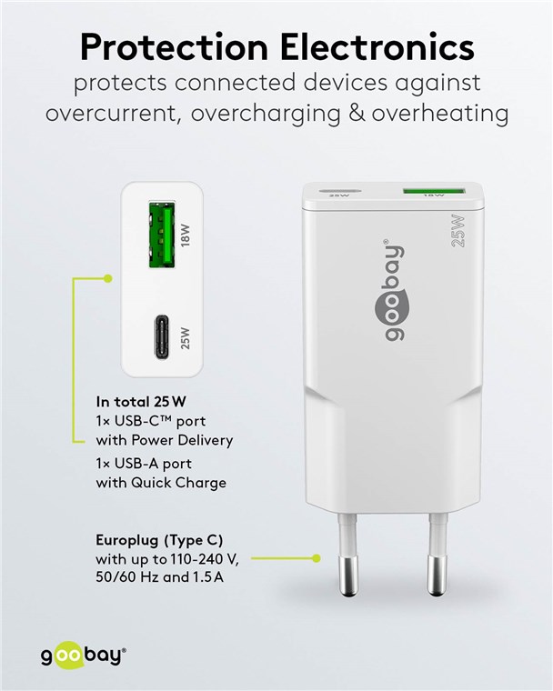 - Die integrierte Schutzelektronik des USB-C™-Ladegeräts sichert angeschlossene Geräte gegen Überstrom, Überladung und Überhitzung