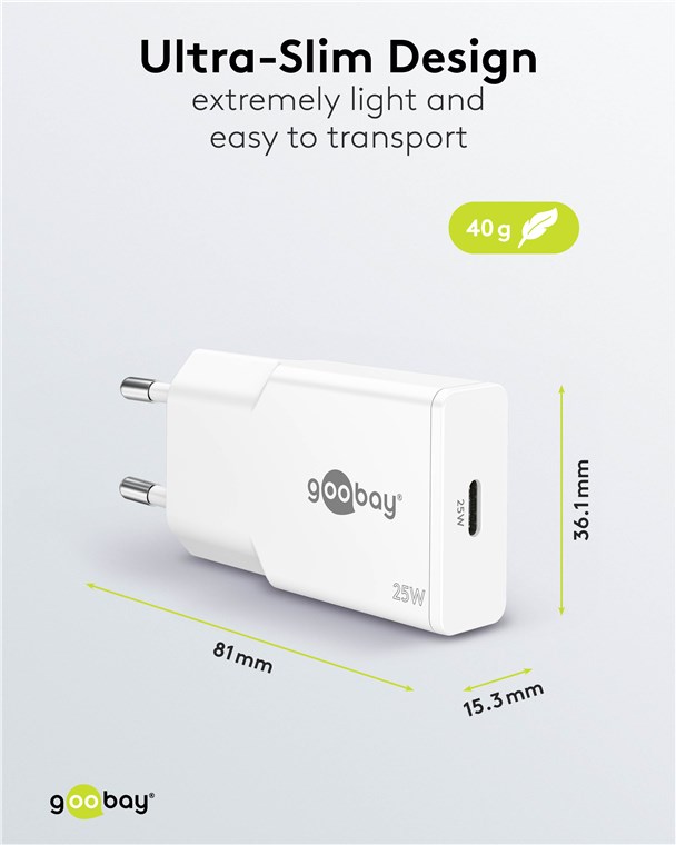 - Im kompakten, reduzierten Slim-Design gleitet das USB-C™-Netzteil einfach in jede Tasche und ist der perfekte Begleiter auf Reisen