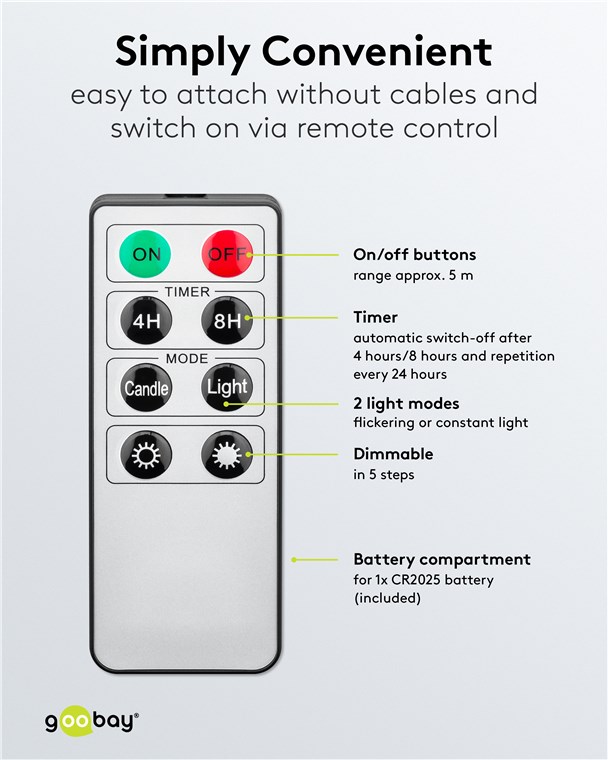 - Remote control with on/off switch and timer function for light intervals (4 h, 8 h, repeats every 24 hours), range approx. 5 m
