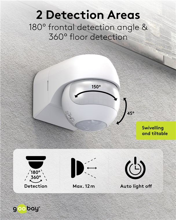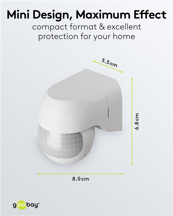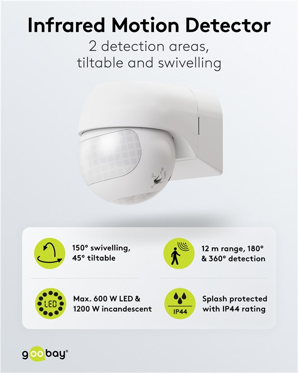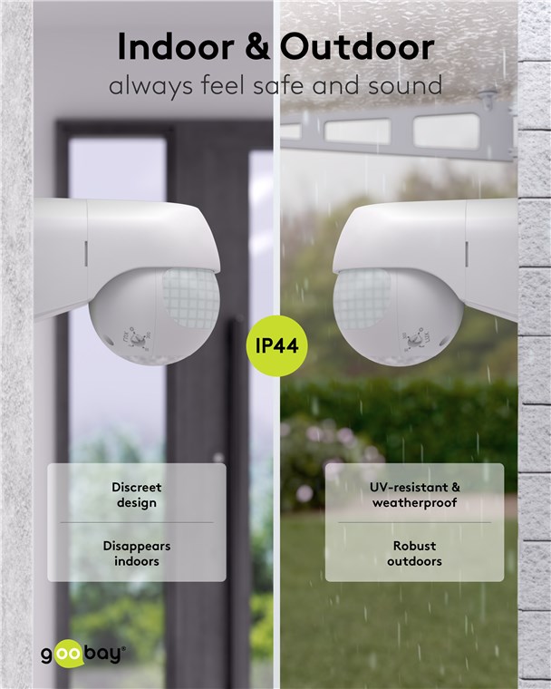 Wind and weather? No problem, the motion detector is IP44-rated, making it perfect for outdoor areas such as gardens, carports or house entrances. The two infrared sensors react to movements from the horizontal direction and from the area below the device, making the motion detector particularly practical for elevated installation. Motion detectors from Goobay – always feel safe and sound.