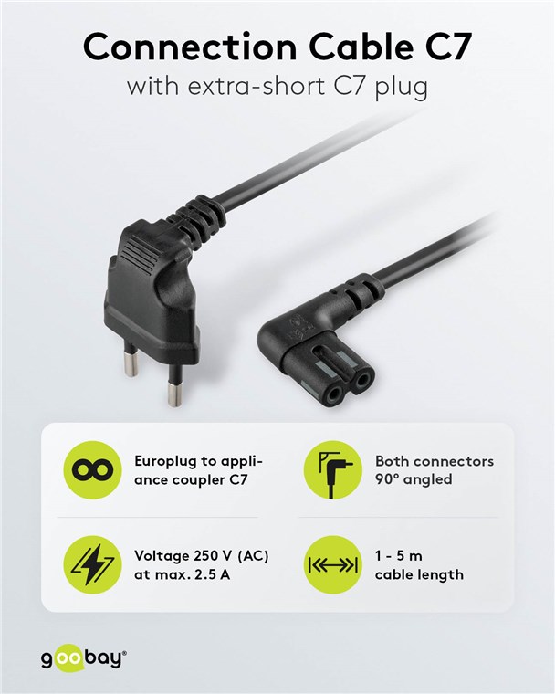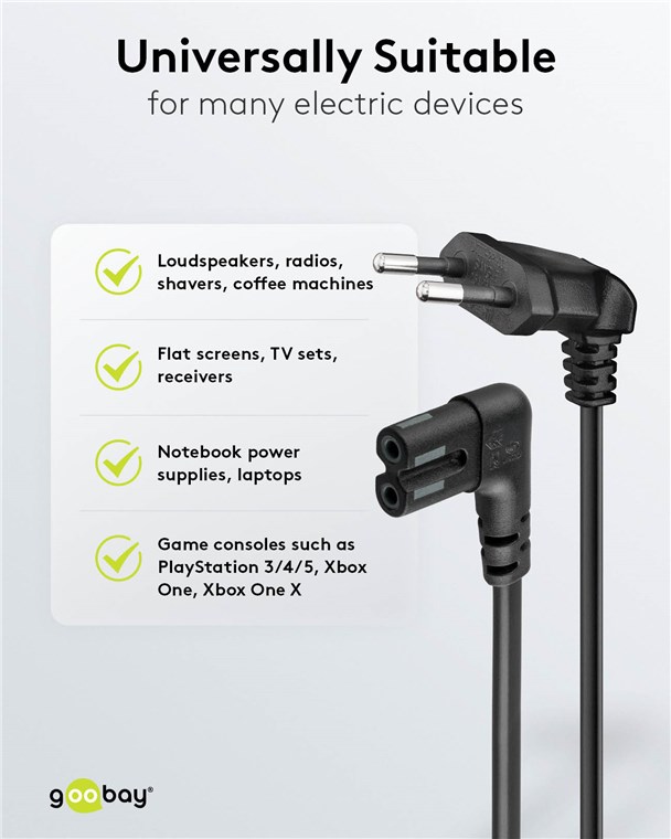 - Universally suitable as a power cord or connection cable on devices without protective earth (GND) and max. 2.5 A load capacity