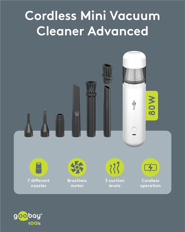 with 80 W, 7 nozzles and 3 brushes for cleaning office accessories, car interiors and hard-to-reach corners