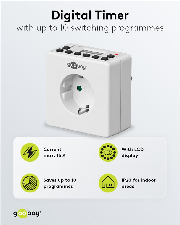 • Digital timer for socket outlet/socket strips enables precise control of electronic devices
