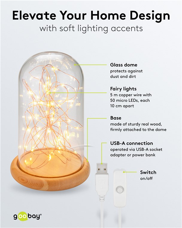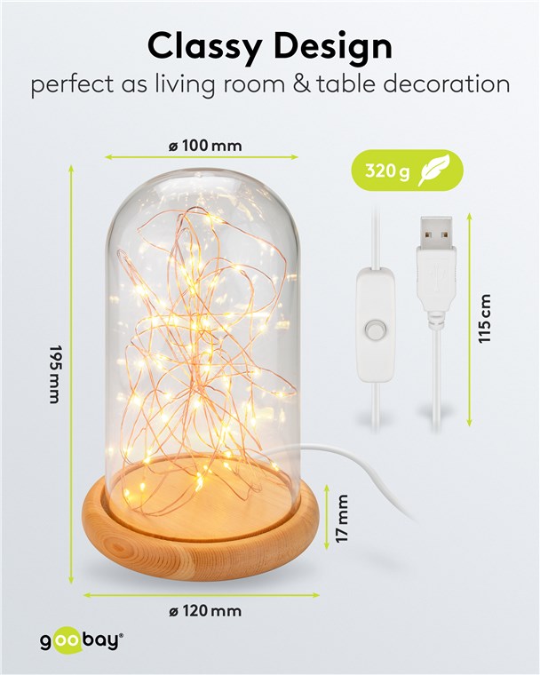 with wooden base, 115 cm USB cable, 5 m light chain with 50 micro LEDs in warm white (2700 K) and switch (On/Off)